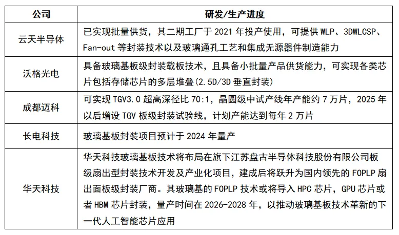 國內方面,以云天半導體、沃格光電、成都邁科等為代表的國內廠商有望打破海外廠商高度壟斷的TGV市場競爭格局。云天半導體已實現批量供貨,其二期工廠于2021年投產使用,可提供WLP、3DWLCSP、Fan-out等封裝技術以及玻璃通孔工藝和集成無源器件制造能力。沃格光電掌握玻璃基板級封裝載板技術,且具備小批量產品供貨能力,其玻璃基板級封裝載板產品采用TGV技術,可實現2.5D、3D垂直封裝。成都邁科可實現TGV3.0超高深徑比70:1,晶圓級中試產線年產能約7萬片,2025年以后增設TGV板級封裝試驗線,計劃產能達到每年2萬片。此外,長電科技已在進行玻璃基板封裝項目的開發,預計2024年實現量產。