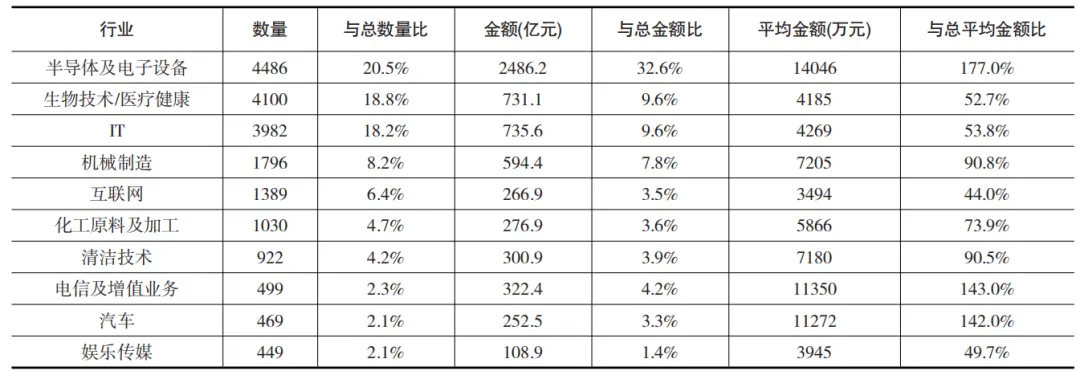 從發展動力來看,區域集成電路產業發展增速由政策驅動轉變為由政府引導基金等資本驅動。長期以來我國集成電路產業已經形成了以國家層面政策、地方政府政策雙向驅動的發展形式,為集成電路產業發展提供充足的動力。而隨著2014年國家集成電路產業投資基金的設立,以及2019年科創板設立與注冊制試點的推動,近年來區域集成電路產業的發展已經逐步從由政策驅動轉變為由資本驅動。而地方政府引導基金作為滿足區域經濟發展需求,帶有特定政策目標的資本工具,更是成為地方政府支持區域集成電路產業等實體經濟發展的主要抓手。根據清科研究中心數據(表2)顯示,政府引導基金投資半導體行業的金額占其比重近1/3,位列所有行業之首。各地方通過設立政府引導基金,對參股的子基金進行返投約束,或者通過直接投資的方式參股項目,要求引導所投項目落地,都加速了區域集成電路產業的集聚和發展。另外,根據清科研究中心數據,我國基金規模前50強的政府引導基金主要集中于東中部地區,東部尤其以長三角、粵港澳大灣區占比最多,整體規模占政府引導基金總規模的50%,對近年來長三角、粵港澳大灣區集成電路產業的快速發展起到了關鍵助力。