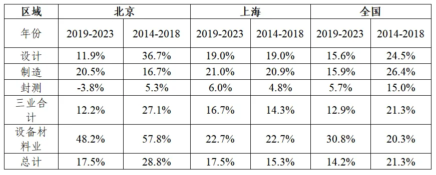 表2 2014-2018年和2019-2023年兩個五年全國、北京、上海的集成電路產(chǎn)業(yè)規(guī)模增速對比