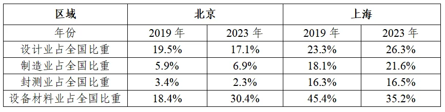 表3 2019年和2023年北京、上海的集成電路產(chǎn)業(yè)各環(huán)節(jié)占全國比重的對比(億元)