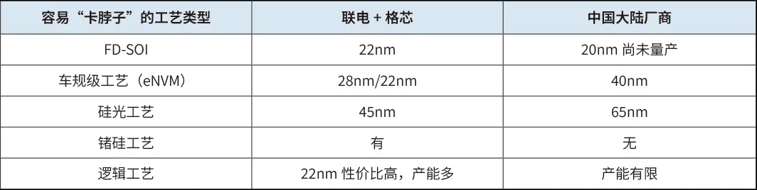 表7 格芯與聯電在28nm/16nm上相對我國企業的優勢