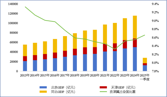 圖1 2013-2025年一季度京津冀三地GDP及全國(guó)占比情況