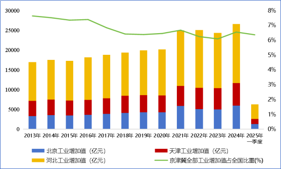 圖2 2013-2025年一季度京津冀地區(qū)全部工業(yè)增加值變化及全國(guó)占比情況