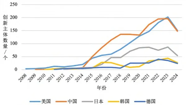 創(chuàng)新主體數(shù)量看,整體呈“階梯式躍升-增速回調(diào)”特征,中美平分秋色。2008—2013年為技術(shù)萌芽期,年均新增主體不足15家;2014年起隨資本涌入與技術(shù)成熟度提升進入爆發(fā)增長期(2014—2017年CAGR達63.8%),2017年突破300家;2018—2023年增速趨緩但仍維持高位(CAGR 15.8%),2023年達到782家的峰值。2024年創(chuàng)新主體數(shù)量首次出現(xiàn)負增長,預(yù)示行業(yè)進入技術(shù)路線收斂、市場出清與頭部集中化的關(guān)鍵調(diào)整期,從“野蠻生長”轉(zhuǎn)向“高質(zhì)量發(fā)展”階段(圖3)。從各國看,自2014年起,我國創(chuàng)新主體數(shù)量快速增長,連續(xù)多年領(lǐng)跑全球。美國作為eVTOL領(lǐng)域研究的先行者,其創(chuàng)新主體規(guī)模保持穩(wěn)定高增長態(tài)勢,憑借技術(shù)先發(fā)優(yōu)勢持續(xù)鞏固全球主導(dǎo)地位。日本、韓國和德國的創(chuàng)新主體數(shù)量雖維持增長態(tài)勢,但受限于市場規(guī)模和產(chǎn)業(yè)水平,與中美兩國的總量差距持續(xù)擴大,eVTOL產(chǎn)業(yè)的發(fā)展?jié)摿﹄y以與中美兩國相比較(圖4)。