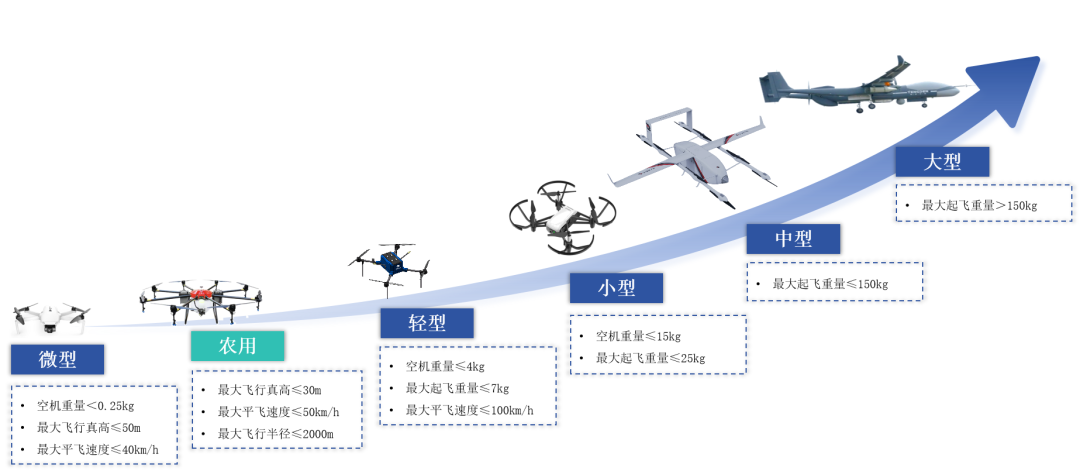 我國無人機管理基本形成“農(nóng)業(yè)、微輕型豁免、小中大型嚴(yán)格”的分層體系。根據(jù)《無人駕駛航空器飛行管理暫行條例》規(guī)定,無人機被劃分為微型、輕型、小型、中型和大型五個類別。其中,微型、輕型無人機由于其體積小、重量輕,主要用于娛樂和拍攝等輕量級應(yīng)用,無需取得操控員執(zhí)照,同時,從事常規(guī)農(nóng)用無人駕駛航空器作業(yè)飛行活動的人員也無需取得操控員執(zhí)照,但應(yīng)當(dāng)由農(nóng)用無人駕駛航空器系統(tǒng)生產(chǎn)者按照國務(wù)院民用航空、農(nóng)業(yè)農(nóng)村主管部門規(guī)定的內(nèi)容進行培訓(xùn)和考核,合格后取得操作證書。