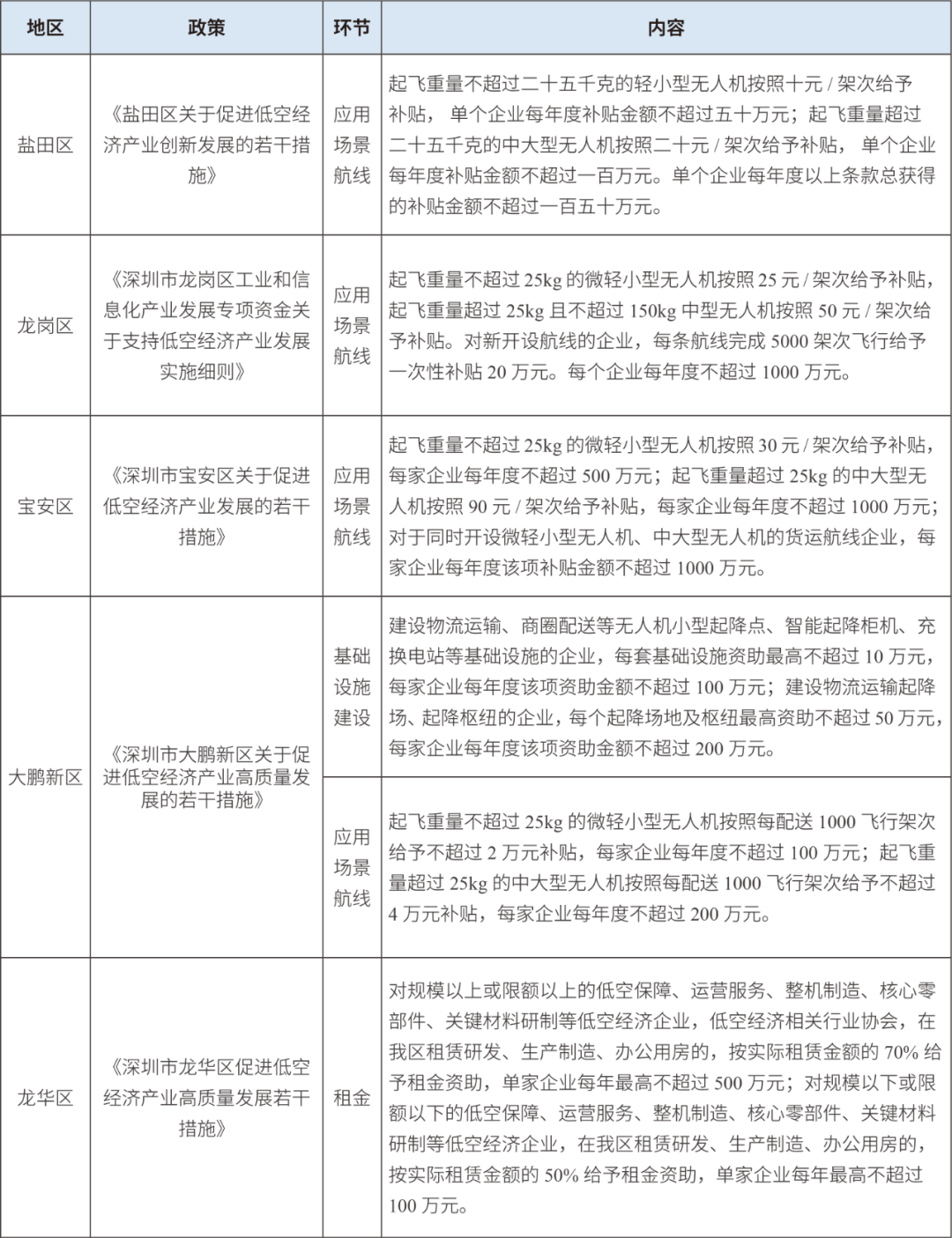 一是謀劃低空經(jīng)濟(jì)頂層設(shè)計(jì)。作為經(jīng)濟(jì)特區(qū),深圳充分發(fā)揮獨(dú)立立法權(quán)出臺(tái)了《深圳市民用無人機(jī)管理暫行辦法(征求意見稿)》等政策法規(guī),從民用無人機(jī)管理、適航認(rèn)證、通航協(xié)調(diào)等方面為無人機(jī)物流發(fā)展提供立法保障。深圳市通過設(shè)立專項(xiàng)資金、給予建設(shè)與運(yùn)營補(bǔ)貼、貼息貸款等方式為無人機(jī)相關(guān)企業(yè)提供資金支持;對于新入駐各區(qū)低空產(chǎn)業(yè)園區(qū)的企業(yè),提供租金補(bǔ)貼,吸引核心零部件企業(yè)落地生產(chǎn)。