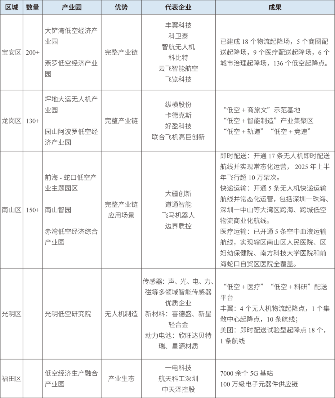 深圳是我國無人機(jī)產(chǎn)業(yè)集聚度最高的地區(qū),各區(qū)依托各自產(chǎn)業(yè)基礎(chǔ)及優(yōu)勢差異化布局開展低空經(jīng)濟(jì)產(chǎn)業(yè)。光明區(qū)依托光明科學(xué)城在信息、生命及新材料方面的優(yōu)勢,發(fā)展無人機(jī)大模型訓(xùn)練、高性能芯片以及新型材料等,重點(diǎn)布局無人機(jī)制造領(lǐng)域。福田區(qū)成立全國首個(gè)“低空經(jīng)濟(jì)生態(tài)融合產(chǎn)業(yè)園”并依托“中國電子第一街”華強(qiáng)北打造“熱帶雨林”創(chuàng)新創(chuàng)業(yè)生態(tài),落地全國首家全產(chǎn)業(yè)鏈無人機(jī)設(shè)備選品中心,聚集200多家物流企業(yè),年交易額超2000億元。南山區(qū)設(shè)立三個(gè)低空經(jīng)濟(jì)產(chǎn)業(yè)園,分別專注航空器維修等低空業(yè)態(tài)、產(chǎn)業(yè)鏈優(yōu)勢企業(yè)及無人機(jī)產(chǎn)品測驗(yàn),同時(shí)不斷開拓應(yīng)用場景,在即時(shí)配送、快遞運(yùn)輸及醫(yī)療運(yùn)輸?shù)确矫嫘纬闪顺B(tài)化運(yùn)營。鹽田區(qū)及大鵬新區(qū)主要布局eVTOL產(chǎn)業(yè),成立了全國第一個(gè)eVTOL產(chǎn)業(yè)園區(qū),建設(shè)了全國首個(gè)融合空域運(yùn)行示范基地。