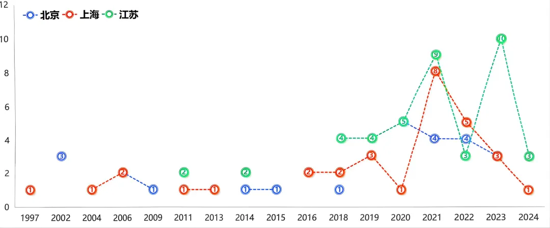 圖4 北京、上海、江蘇獲批上市創新藥的年份分布情況