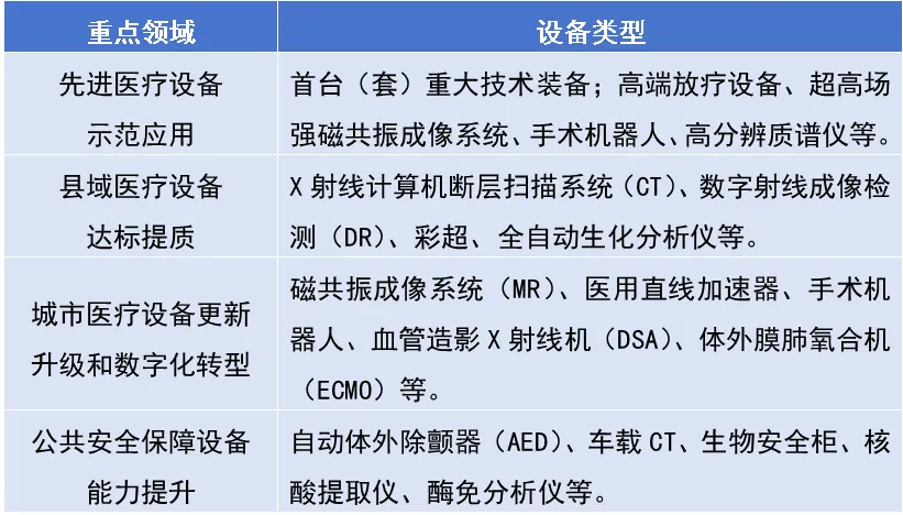 重點支持高水平醫院開展高端放療設備、超高場強磁共振成像系統、手術機器人、高端超聲設備等技術水平先進、應用前景廣闊、實現重大技術突破的先進醫療設備及核心部件采購示范應用,加快形成“示范應用-反饋改進-水平提升-輻射推廣”的醫療設備創新迭代體系,示范帶動醫療設備創新鏈、服務鏈、產業鏈優化升級。