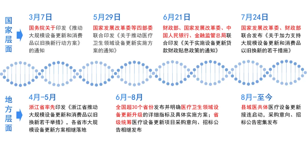 國家層面:2024年3月7日,國務院印發《推動大規模設備更新和消費品以舊換新行動方案》,提出到2027年,工業、農業、建筑、交通、教育、文旅、醫療等領域設備投資規模較2023年增長25%以上。隨后,國家發展改革委等四部委印發《關于推動醫療衛生領域設備更新實施方案的通知》,部署實施醫療領域設備更新。同時,財政部等部委也相繼發布配套支持舉措,超長期特別國債資金按照項目總投資的40%-80%比例支持;中央財政貼息1.5個百分點。