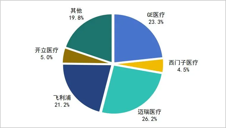 我國US市場規模約180億元,GE醫療(26%)、邁瑞醫療(24%)、飛利浦(24%)三家企業合計占據市場75%以上份額。隨著設備更新落地,國產品牌市場份額占比明顯提升,截至2024年三季度,US國產品牌占比提升至41%(邁瑞醫療26%、開立醫療5%,其他10%),GE醫療、飛利浦分別下降至23%、21%,預計2024年第四季度以及2025年上半年,隨著邁瑞醫療、開立醫療等企業參與更多設備更新采購,國產品牌市場份額將進一步快速提升。