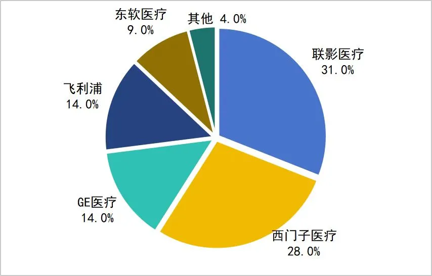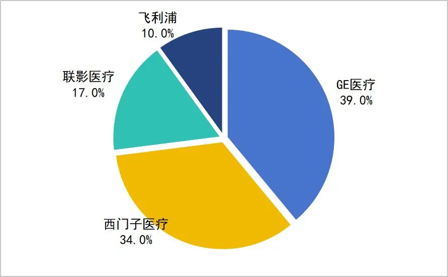 MR主要包括MR(1.5T)和MR(3.0T)兩種。其中,MR(3.0T)以其更高的信噪比、空間分辨率和掃描速度,極大提升了診斷精度,臨床應用日益廣泛,占據MR總體市場超52%的市場份額,且市場份額高度集中,GE醫療(39%)、西門子醫療(34%)、聯影醫療(17%)三家企業合計市占率近90%。聯影醫療、東軟醫療加速入局本次醫療設備更新,提升MR國產化率,其中東軟醫療以1.5T產品為主,聯影醫療在主導1.5T市場份額的基礎上強勢進軍3.0T市場。