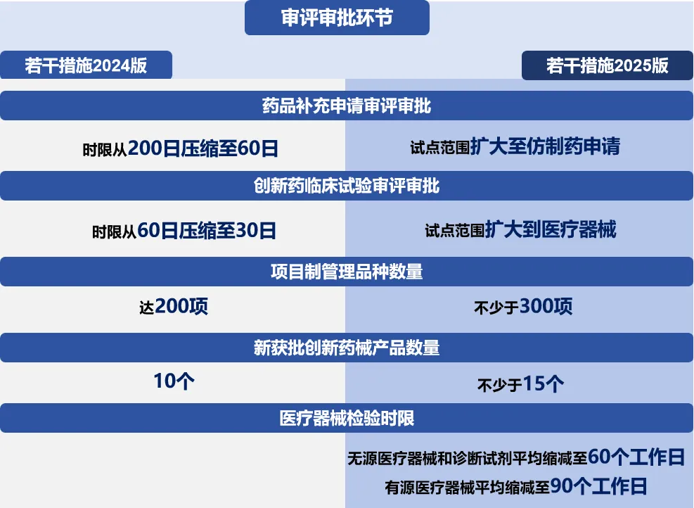 臨床試驗審評審批方面,持續(xù)深化國家藥監(jiān)局相關(guān)試點(diǎn)工作,將優(yōu)化創(chuàng)新藥臨床試驗審評審批試點(diǎn)擴(kuò)大到醫(yī)療器械,將藥品補(bǔ)充申請審評審批試點(diǎn)爭取擴(kuò)大至仿制藥申請。藥械檢驗檢測能力方面,首次明確提出提效量化目標(biāo),推動實現(xiàn)無源醫(yī)療器械和診斷試劑平均縮減至60個工作日、有源醫(yī)療器械平均縮減至90個工作日,持續(xù)保持醫(yī)療器械檢驗?zāi)芰θ珖I(lǐng)先地位。針對臨床急需藥械產(chǎn)品,在全國率先實現(xiàn)即收即檢。項目制管理方面,持續(xù)擴(kuò)大服務(wù)范圍和對象,較2024年新增納入項目制服務(wù)藥械品種數(shù)量100項,累計達(dá)300項。多項舉措助力藥械產(chǎn)品上市“加速度”,實現(xiàn)2025年新獲批創(chuàng)新藥械產(chǎn)品數(shù)量不少于15個。