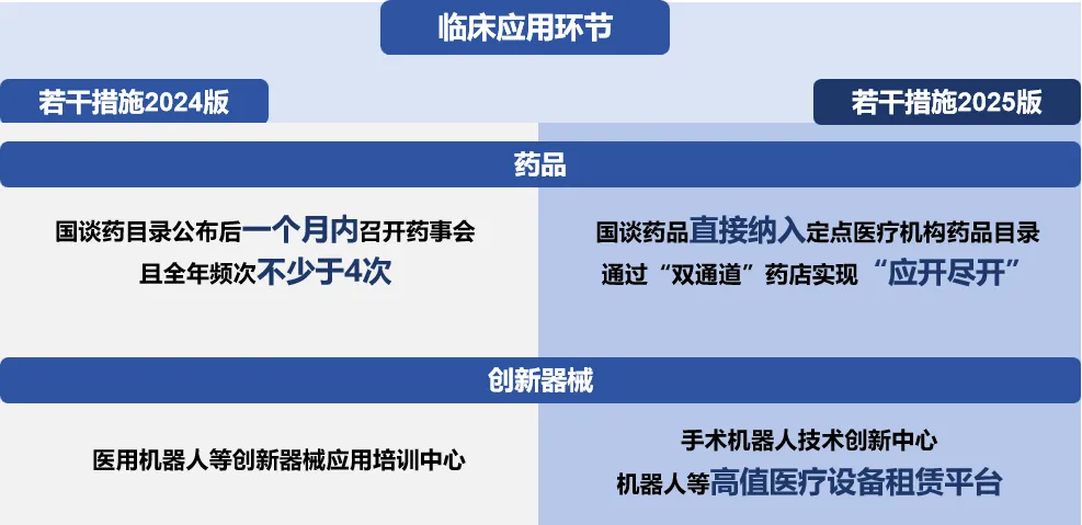 創(chuàng)新藥方面,相較于上海、廣東等地增加召開藥事會頻次,北京率先提出國談藥可直接納入全市定點(diǎn)醫(yī)療機(jī)構(gòu)藥品目錄,無需召開藥事會,醫(yī)療機(jī)構(gòu)可通過“雙通道”藥店實現(xiàn)“應(yīng)開盡開”。此外,支持醫(yī)療機(jī)構(gòu)針對創(chuàng)新價值高但臨床數(shù)據(jù)較少、實際證據(jù)不充分的藥物開展真實世界研究,驗證藥物臨床價值。創(chuàng)新醫(yī)療器械方面,搭建機(jī)器人等高值醫(yī)療設(shè)備租賃平臺,運(yùn)用市場化方式打通創(chuàng)新醫(yī)療器械入院“最后一公里”,破解創(chuàng)新醫(yī)療器械高成本與推廣難的矛盾,加快手術(shù)機(jī)器人入院應(yīng)用和創(chuàng)新迭代。