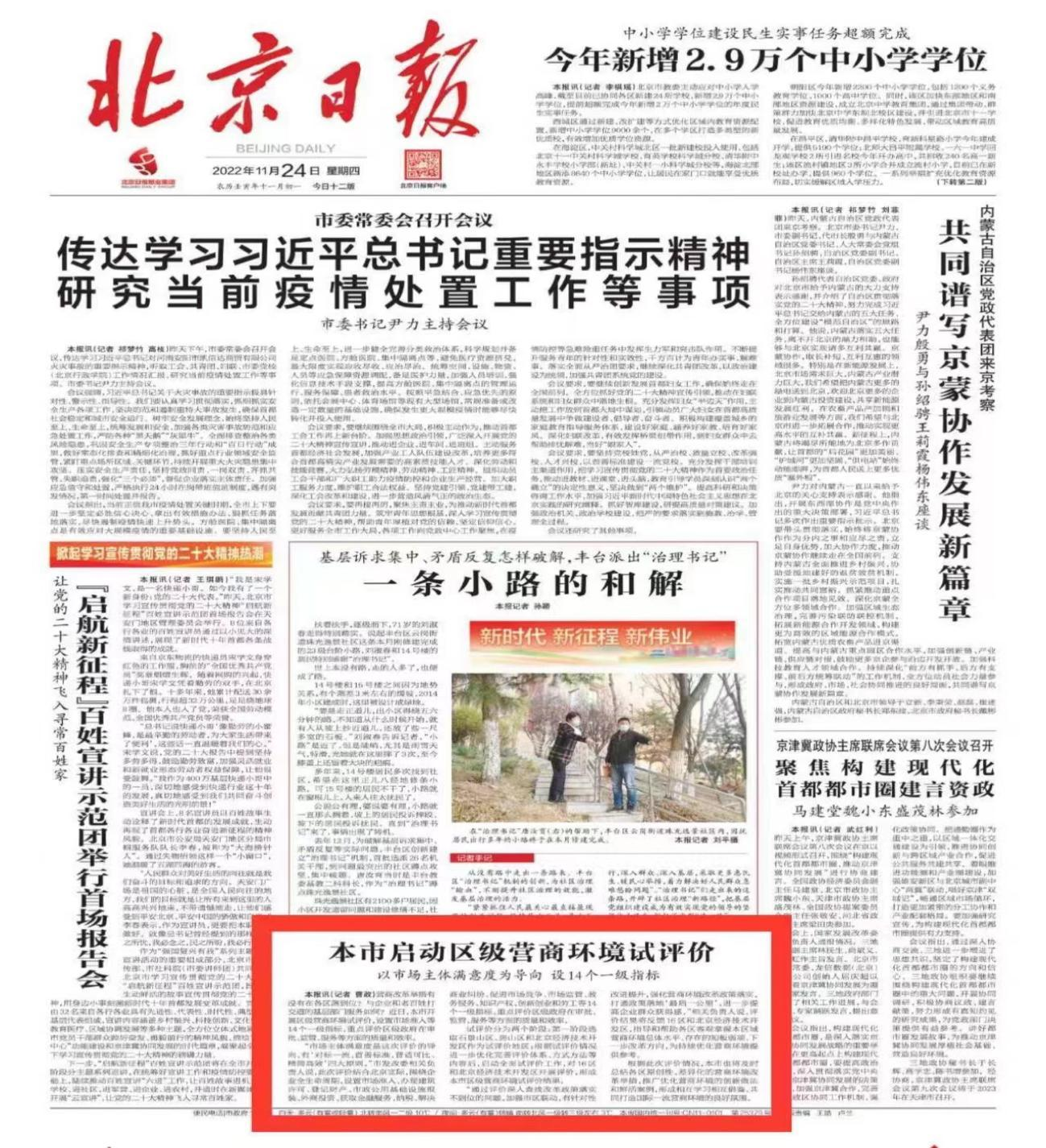 11月24日,北京日?qǐng)?bào)頭版刊登了《全市啟動(dòng)區(qū)級(jí)營(yíng)商環(huán)境試評(píng)價(jià)》報(bào)道文章。此次全市區(qū)級(jí)營(yíng)商環(huán)境評(píng)價(jià)工作由北京市發(fā)展改革委負(fù)責(zé)組織實(shí)施,并委托咨詢公司作為評(píng)價(jià)工作的牽頭承擔(dān)單位具體開展實(shí)施。